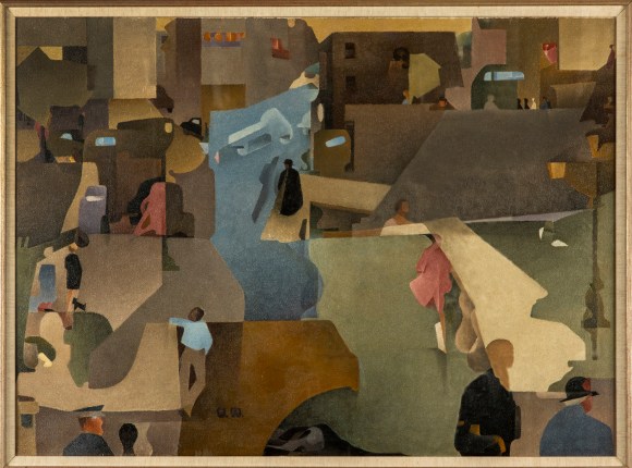 Having not seen the painting itself, due to current circumstances, it’s probably not fair to comment on it, but from the image it’s certainly one of Una’s more complex and enigmatic works. The bridge motif is clear in the jigsaw-like quadrants of colour she employs – dove-greys, moss greens and various shades of blue. This geometric patterning was a feature of her later work, but here it’s used in a much more abstract way. In its style and colour palette, Una seems to be harking back to a kind of fluid pre-cubism.