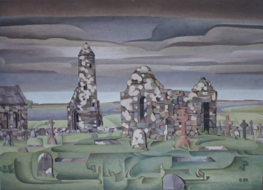 At first sight, Una’s 1958 depiction of the sixth century monastic site Clonmacnoise (oil on canvas, dimensions not known) seems straightforward enough. It’s a partial view of this seven-acre heritage site that comprises a relict monastic city with two round towers, a cathedral and nunnery, nine churches and 700 early Christian grave slabs.