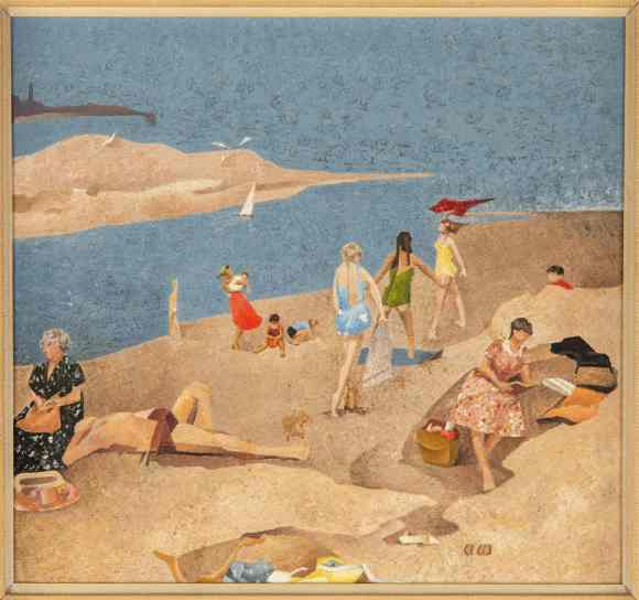 With the help of Eugene Watters’ niece, Georgina O’Donovan, we’ve identified the new find as To the Sea (oil on canvas, 43.1 x 54.6 cms) dated to 1962. It depicts a couple on bicycles, viewed from the back, as they cycle towards the sea, their swimming gear rolled up in towels on the back carriers.