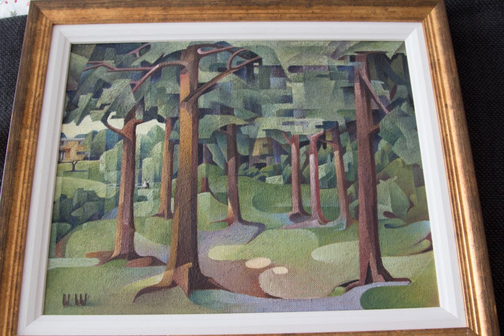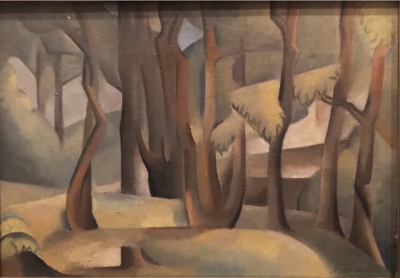 This is Gum Trees dated to 1933-35, by Dorrit Black (1891 – 1951), oil on canvas (42.0 x 59.8 cms), but it is so redolent of Una’s landscape work – the cubist influences, the undulating foreground, the stark geometry of the trees, the very deep recession of the work – that it could have been made by Una in another life. The techniques are similar to those in Wild Apples or The Pine Wood and the colour tones are reminiscent of the recently discovered To the Sea.