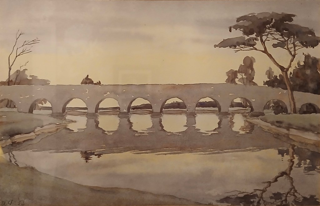 The second find is a watercolour, untitled, showing Ballyforan Bridge near Ballinasloe, which was completed in 1953. This was a favoured picnic site for the Watters family and a meeting point for fishing expeditions in the summer consisting of Eugene, Una, his brother Tom and wife Bridie, and their children. The watercolour is delicate in its rendering, serene in its mood showing the glassy River Suck on a still, mauve summer’s evening, while a man driving a hay cart is seen crossing the bridge. The arches of the bridge (bridges, again!) and the spindly trees either side are echoed in the water giving a shimmering, ethereal feel the work.