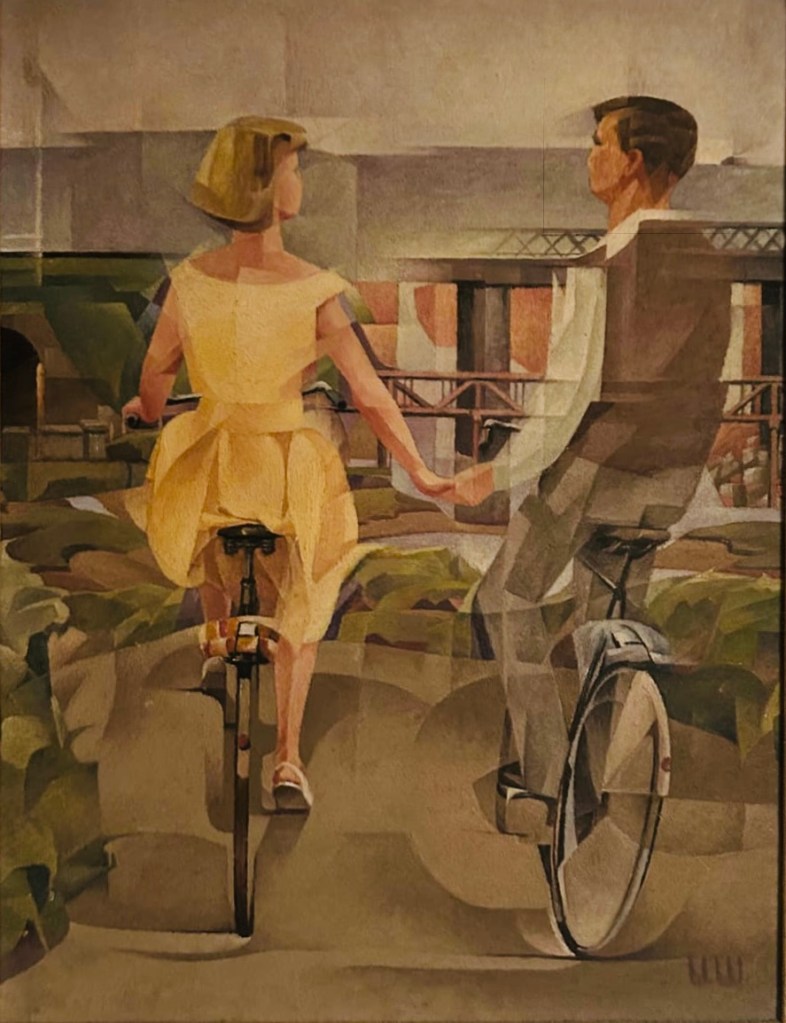 Una’s rendering of physical gestures often hints at emotional drama. The woman’s back is to us so she remains mysterious, but we see the man sketchily in profile as he holds her hand and turns to her. A beam of weak misted light from an unseen source grazes her shoulder, but it mirrors the slant of his gaze. She’s cycling in a straight line, but the front wheel of his bike is not evident, merely suggested by a series of veering circles. The implication is he’s having a slight wobble. Is he about to fall in more ways than one?