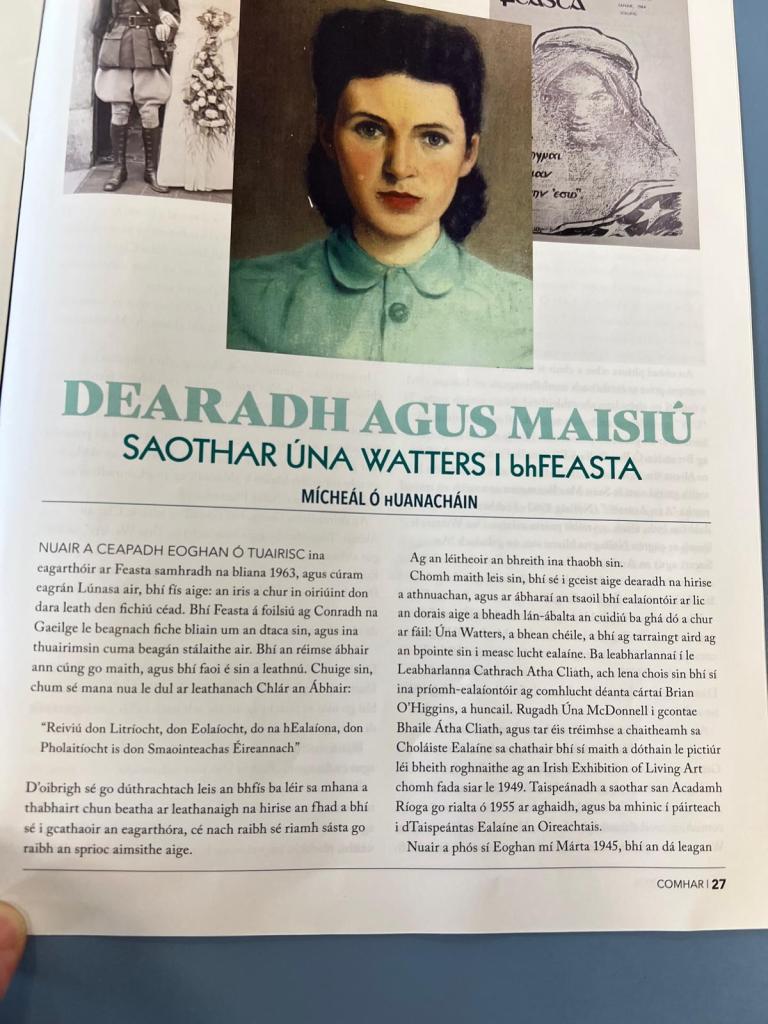 Her work for Feasta has been documented in an important article by broadcaster and Irish scholar Mícheál Ó hUanacháin, in the August issue of Comharhttps://comhar.ie/iris/85/8/dearadh-agus-maisiu/. Ó hUanacháin was heavily involved in the production of Feasta and saw Una’s work for the magazine at first-hand.