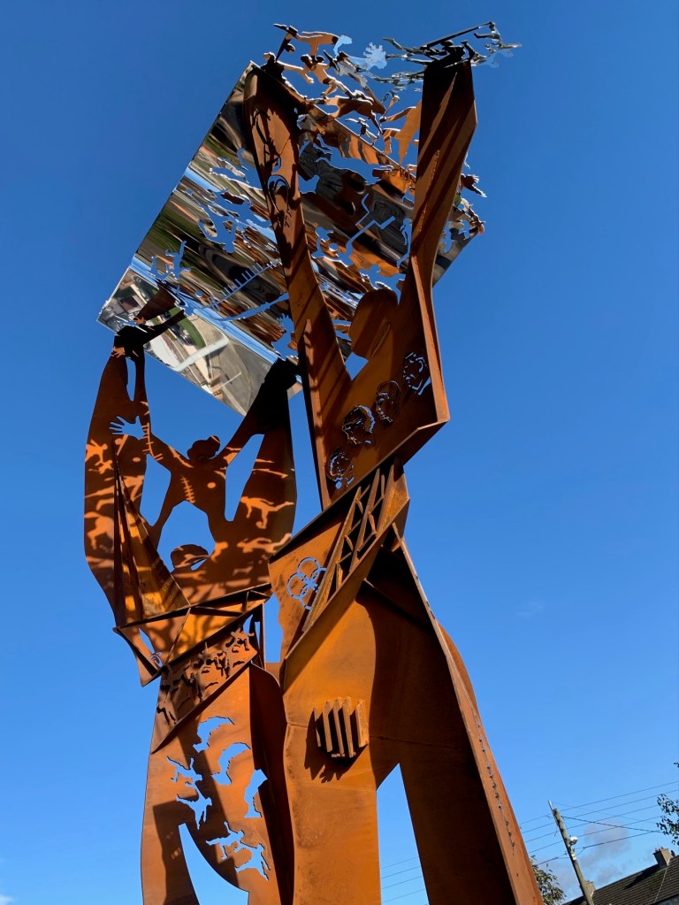 The Bridge: Finglas Ravens Soar, is a seven-metre-tall steel sculpture by Sara Cunningham-Bell, commissioned by Dublin City Council/Sculpture Dublin, for the 20-acre public park comprising two figures with arms raised holding high a mirrored steel ‘river rug’.
